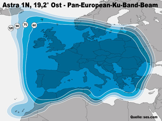 Sie wollen auch in Ihrem Ferienhaus, Ihrem Wohnmobil oder auf Ihrer Yacht nicht auf eine SAT-Anlage (auf 12 V Basis) verzichten? K(aum)ein Problem. Wir beraten Sie gerne! Beispielhaft sehen Sie am Ende dieses Beitrags und ausführlich auf der folgenden Seite die Abdeckung des Satelliten Astra 1 N (19,2° Ost), über den auch viele deutschsprachige Programme abgestrahlt werden, und den notwendigen Durchmesser der SAT-Schüssel, um einen störungsfreien Empfang in einem bestimmten Gebiet zu gewährleisten.